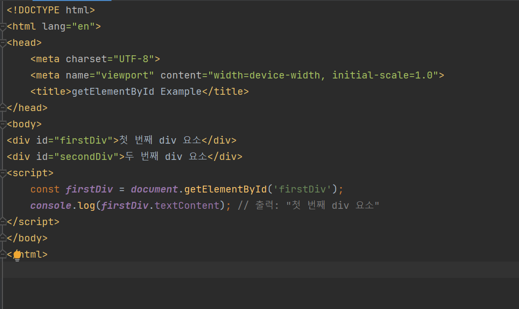 위의 예시에서 getElementById('firstDiv')는 ID가 "firstDiv"인 첫 번째 div 요소를 선택합니다.