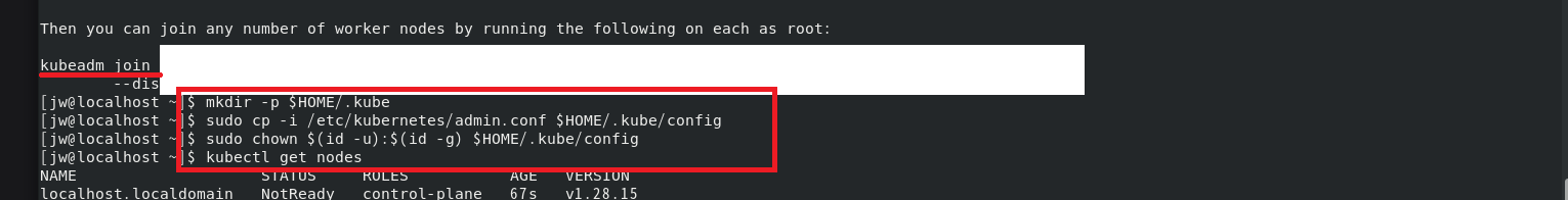 출력되는 kubeadm join이후 명령어를 복사해 둡니다. 나중에 워커 노드를 추가할 때 사용됩니다.