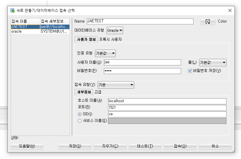 2. 새창이 나오면 아래와 같이 Name, 사용자이름,비밀번호,호스트이름,포트,sid를 입력해줍니다.